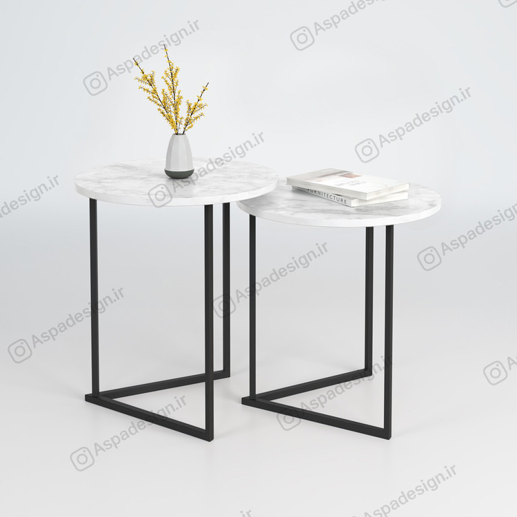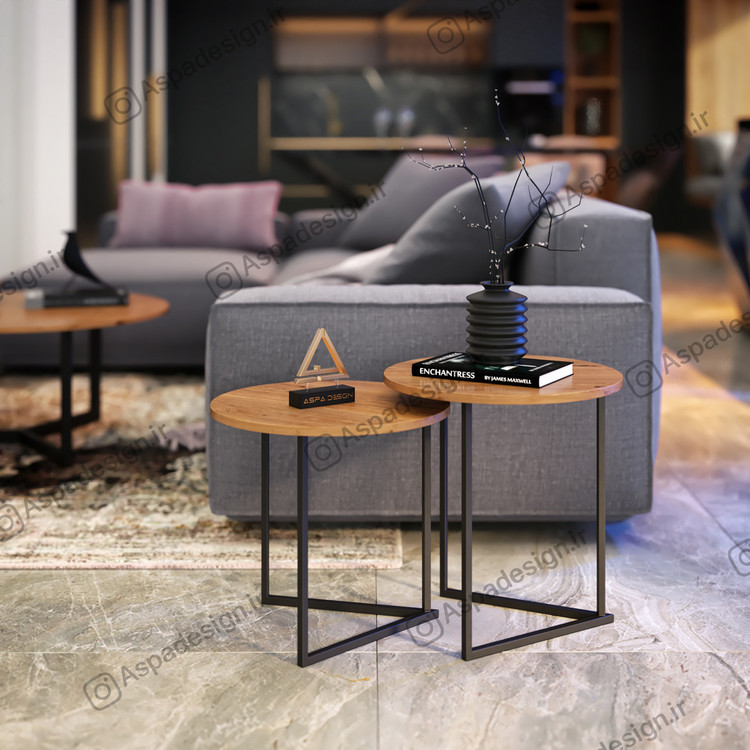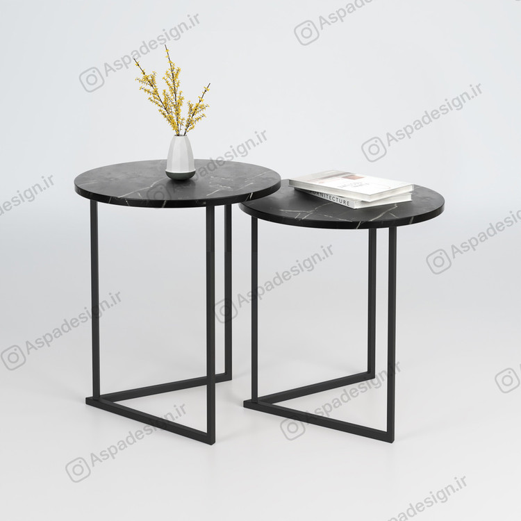 میز عسلی A-100 آسپادیزاین مجموعه ای دو عددی است که این میز دارای پایه های فلزی با رنگ کوره ای مشکی رنگ است و قطر صفحه های آن 45 سانتی متر میباشد.