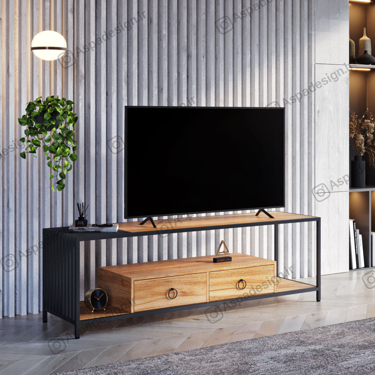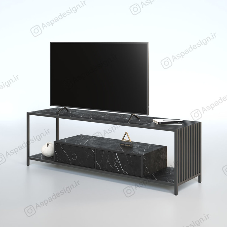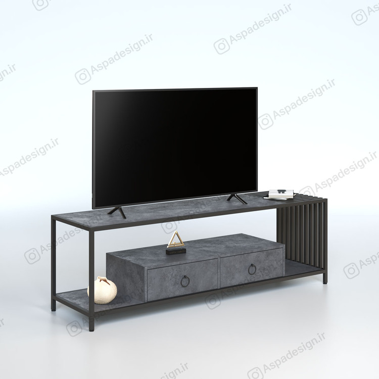 میز تلویزیون مدل T-103 با اندازه اصلی 160x40سانتی متر در ارتفاع 45 سانتی متر است . پایه های میز از جنس پروفیل صنعتی با رنگ کوره ای هست و صفحات آن از ام دی اف مرغوب با رنگ های قهوه ای طرح چوب، طوسی بتنی، سفید و مشکی طرح سنگ تهیه شده است.